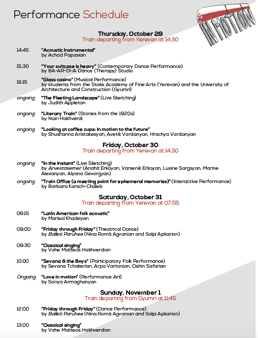 - 17:40 The passengers of our opening train ride arrive in Gyumri. Upon arrival: short city tour starting at Gyumri train station. (Free event)
