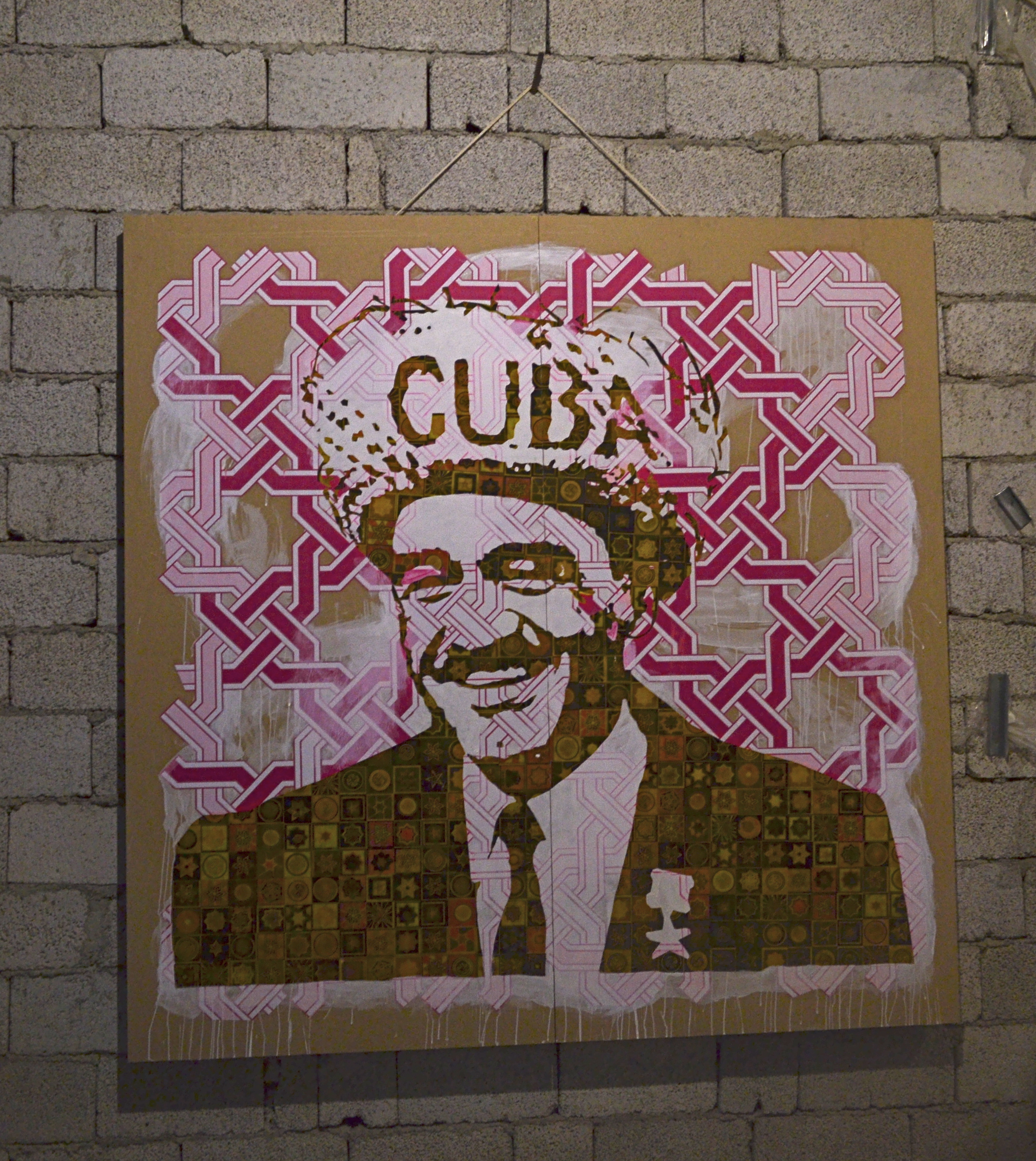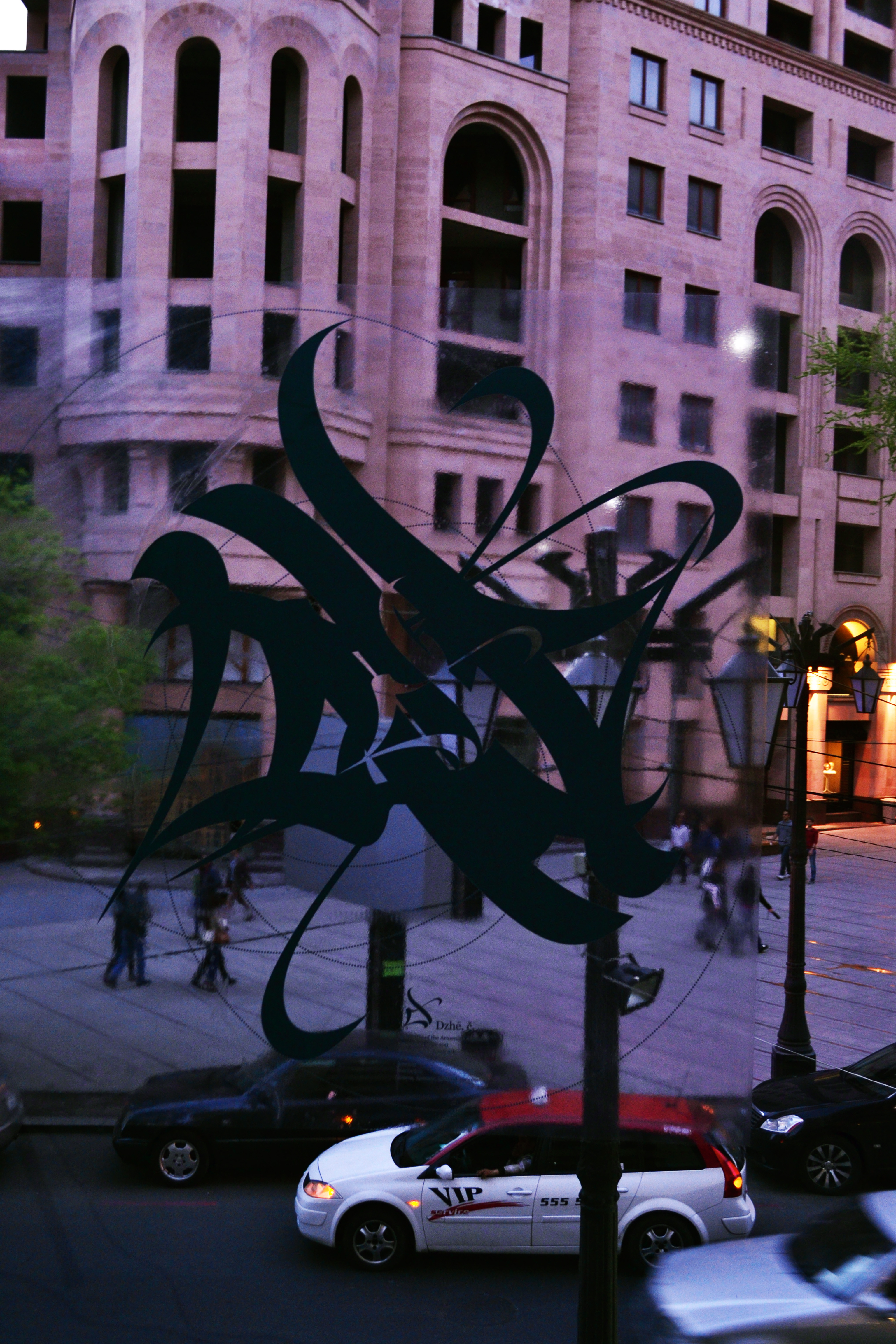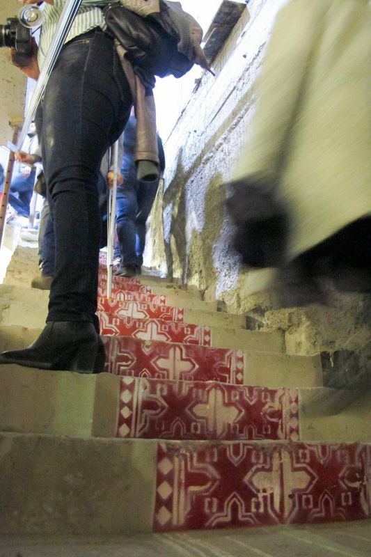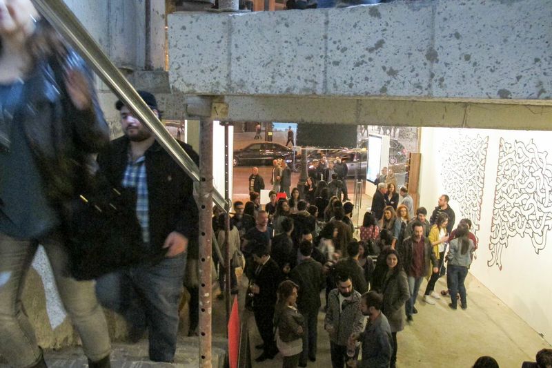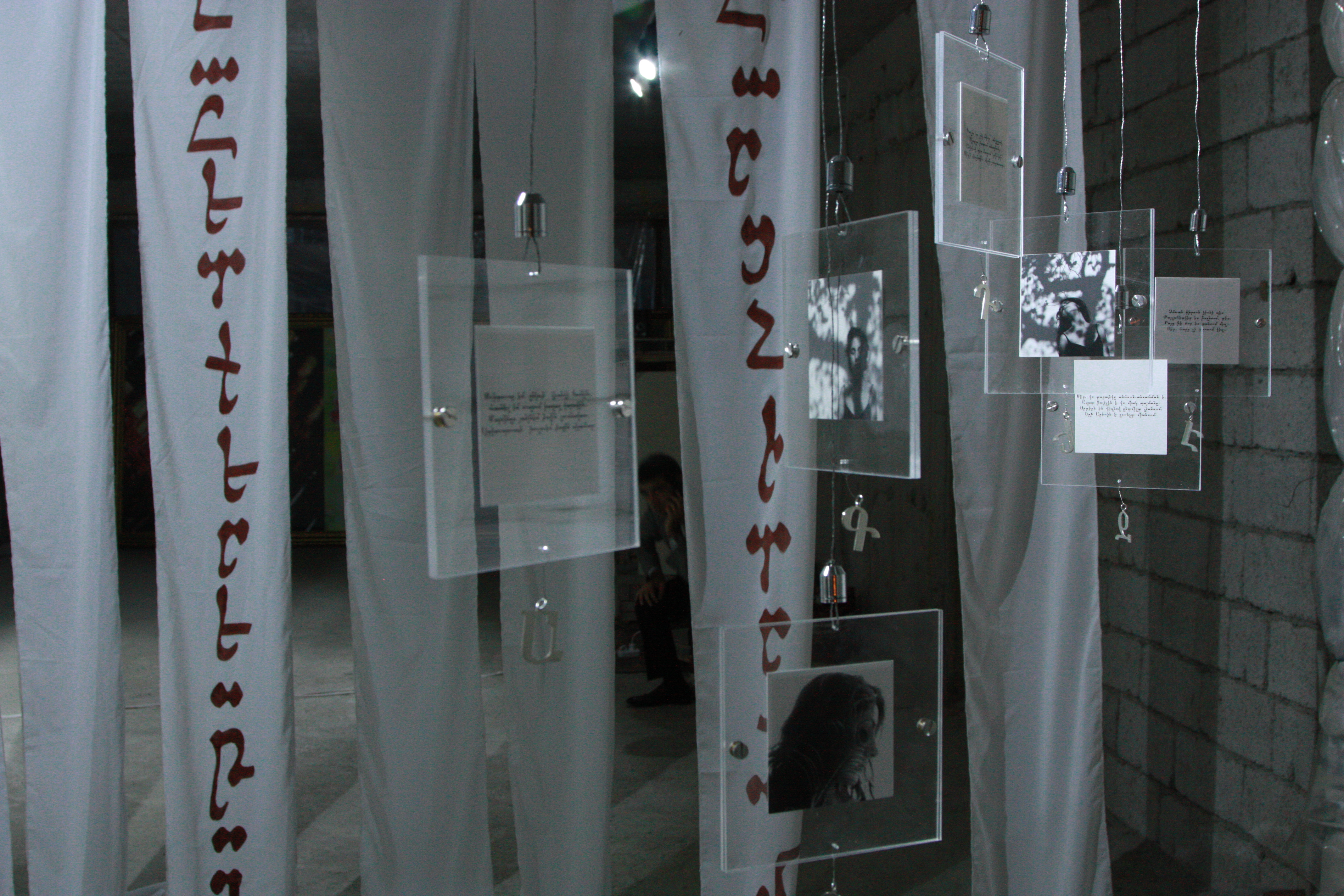 On the second floor of HAYP Pop Up Gallery, the works take on a different tone, examining connectivity through time and tradition. The works of Ruben Malayan and Nairi Khatchadourian are contemporary interpretations of classical Armenian calligraphy, while the graphic writing of Samvel Saghatelian takes a playful formalistic approach to the contrasting forms of Latin and Armenian letters. Similarly, Lusine Kirakosyan combines the past and present in her rug stencil on the gallery steps that shows a traditional or contemporary design depending on one’s viewpoint. In the photography of Asya Yaghmurian and Florencia Babouian, the artists take a closer look at the marginalized components of contemporary culture, whether neglected historic buildings or sub-cultures in village communities, their subjects often remain disconnected from the major activities and concerns of the city center.